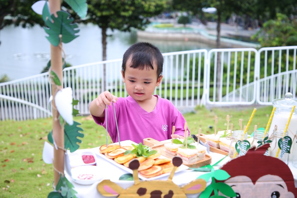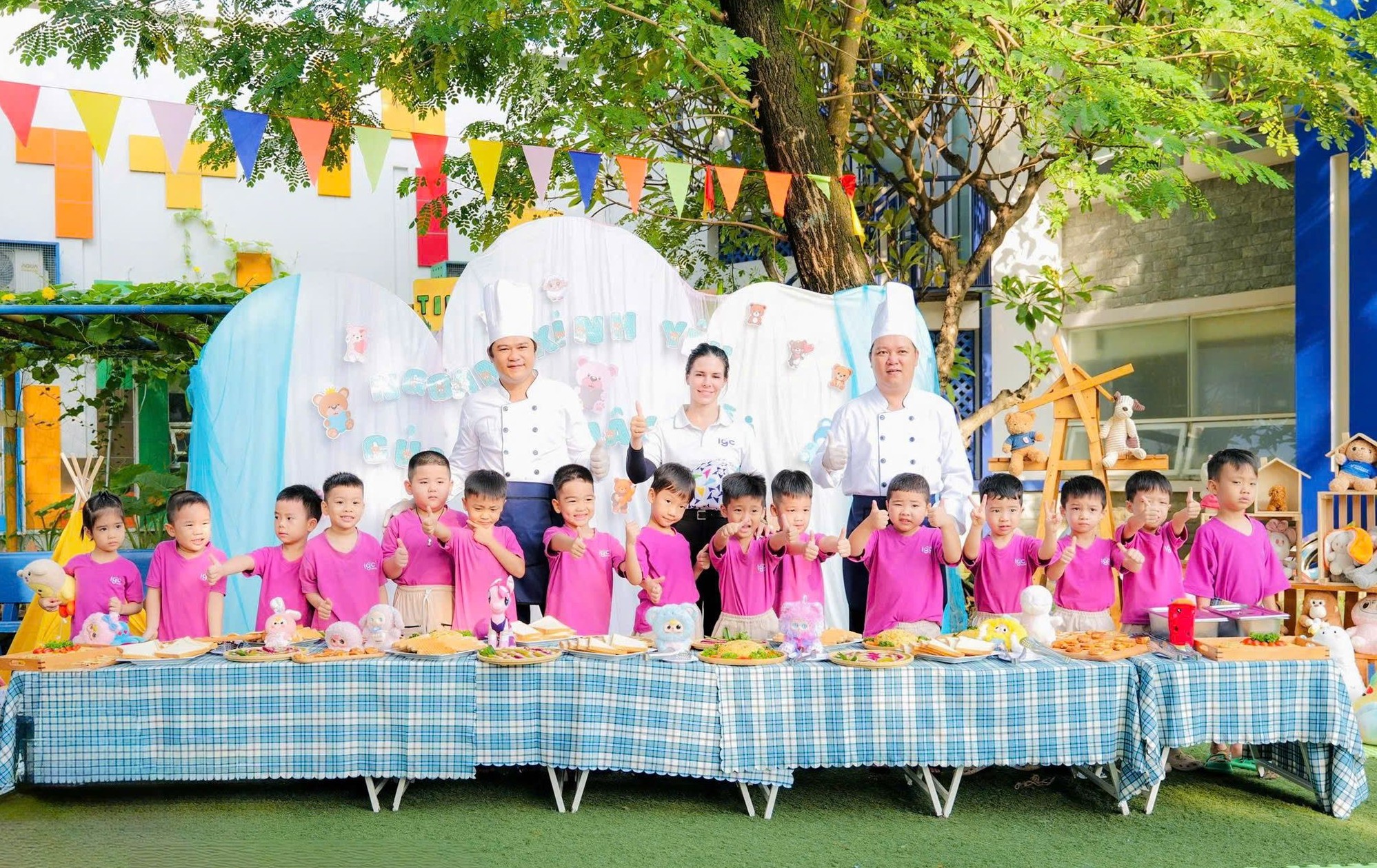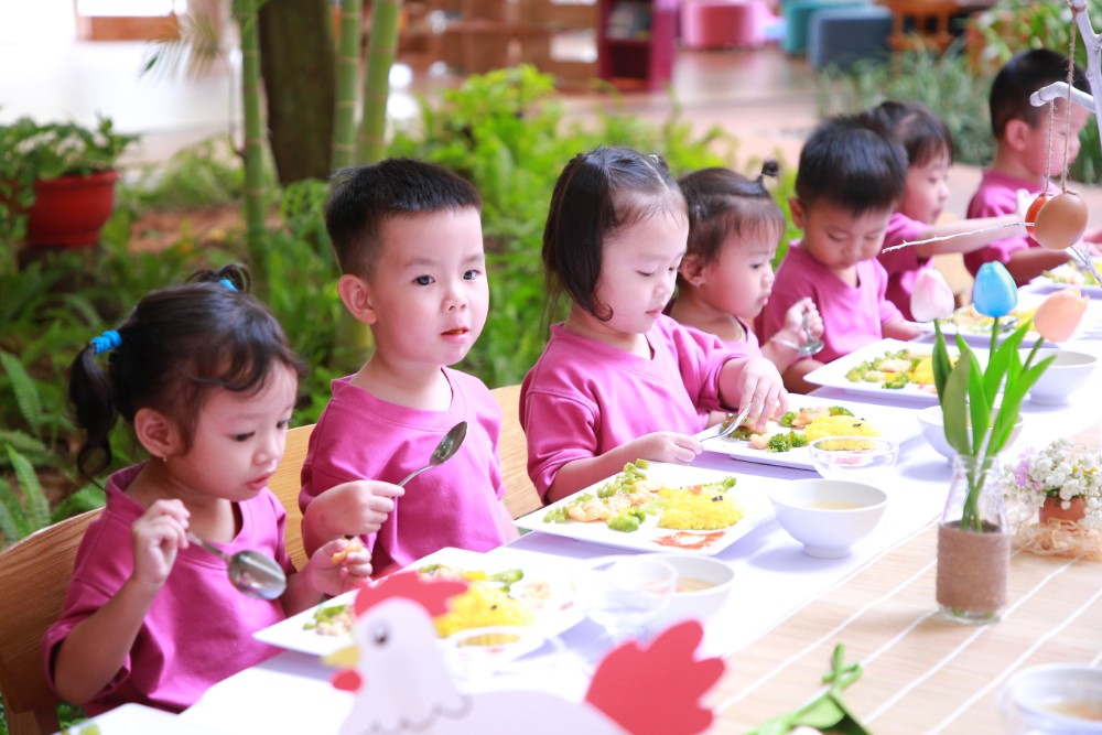Nhà trường hiểu rằng, trẻ không chỉ thưởng thức món ăn với thính giác và vị giác, mà cảm xúc và thị giác cũng góp phần không nhỏ cho trải nghiệm ăn uống của trẻ. Do đó, ngoài việc trực tiếp tham gia vào quá trình chuẩn bị nguyên liệu, chế biến và hoàn thiện những chiếc bánh thơm ngon cùng cô và các bác đầu bếp. Ở mỗi tiệc bánh, cô và trẻ sẽ cùng nhau chuẩn bị những bàn tiệc trà đầy màu sắc, sáng tạo, có khi là những lọ hoa nhỏ xinh xinh, hay là những chiếc nơ được tự tay trẻ thắt để trang trí cho từng chiếc ghế ngồi. Tất cả tạo nên một không gian đẹp mắt, ấm cúng, và là niềm mong đợi nhất của trẻ trong một ngày học tập tại trường.
