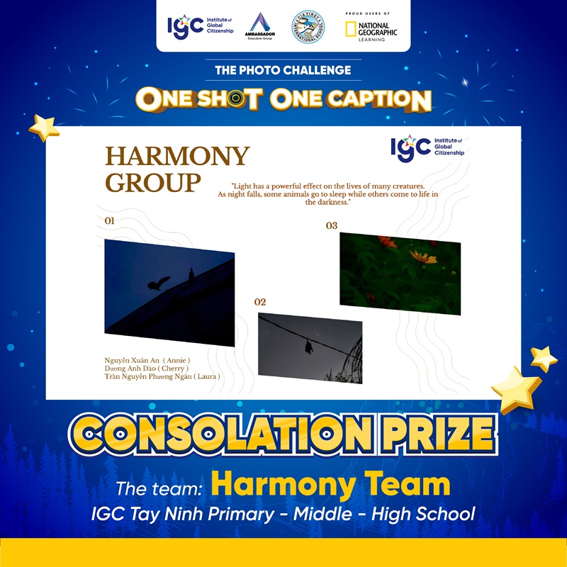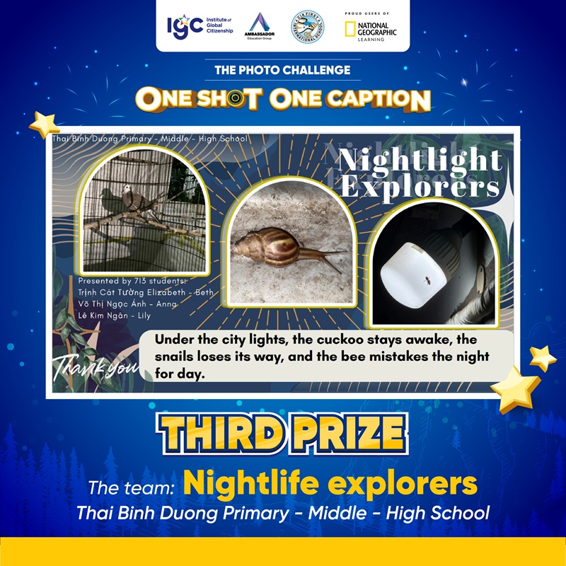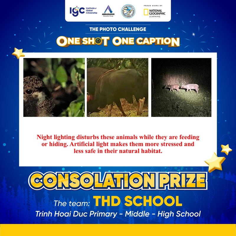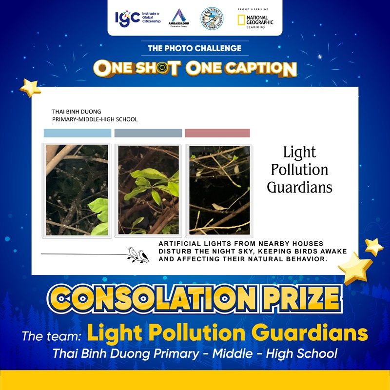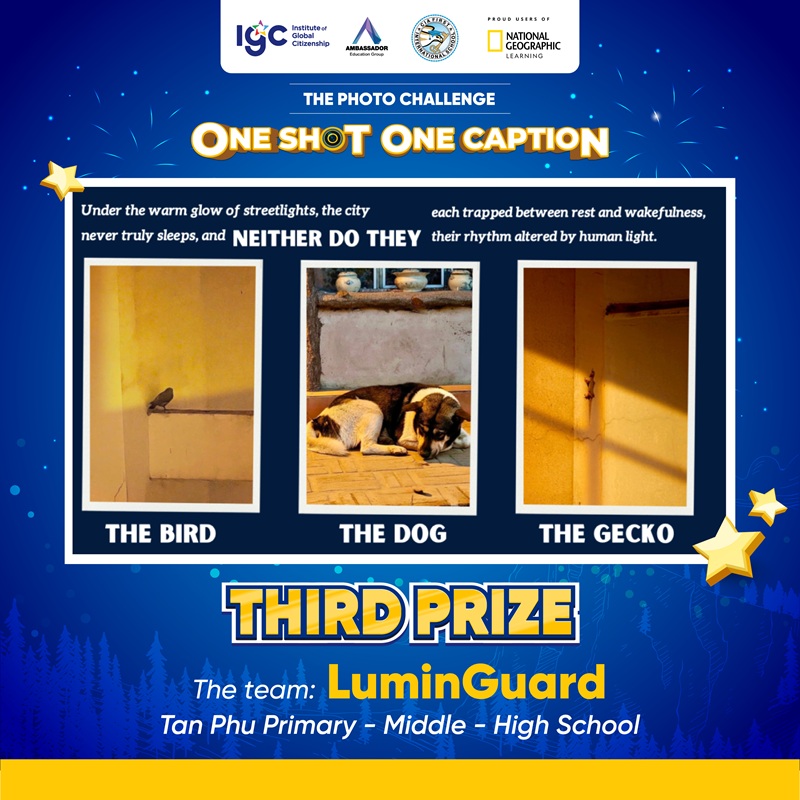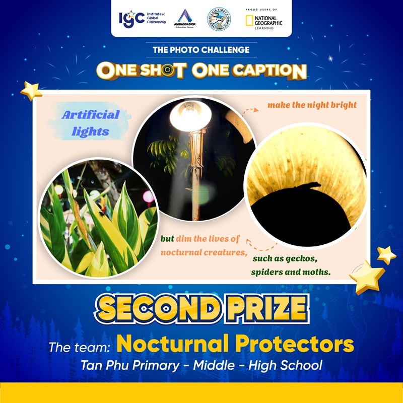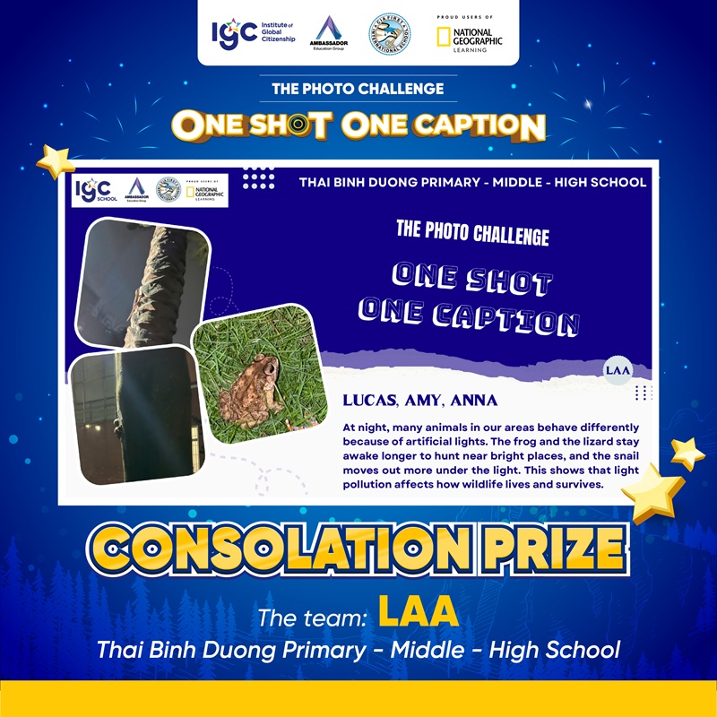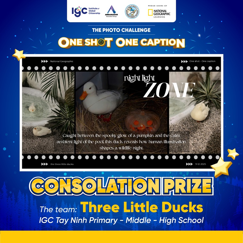 Tiếp nối cảm hứng từ buổi giao lưu cùng Nhà thám hiểm National Geographic – Anusha Shankar vào tháng 9/2025, IGC Group triển khai Thử thách Chụp ảnh “ONE SHOT ONE CAPTION” với chủ đề “How do lights at night affect wildlife in your area?”. Hoạt động có sự tham gia của học sinh thuộc hệ thống IGC School cùng học sinh quốc tế đến từ CIA FIRST (Campuchia) và AEG (Thái Lan).